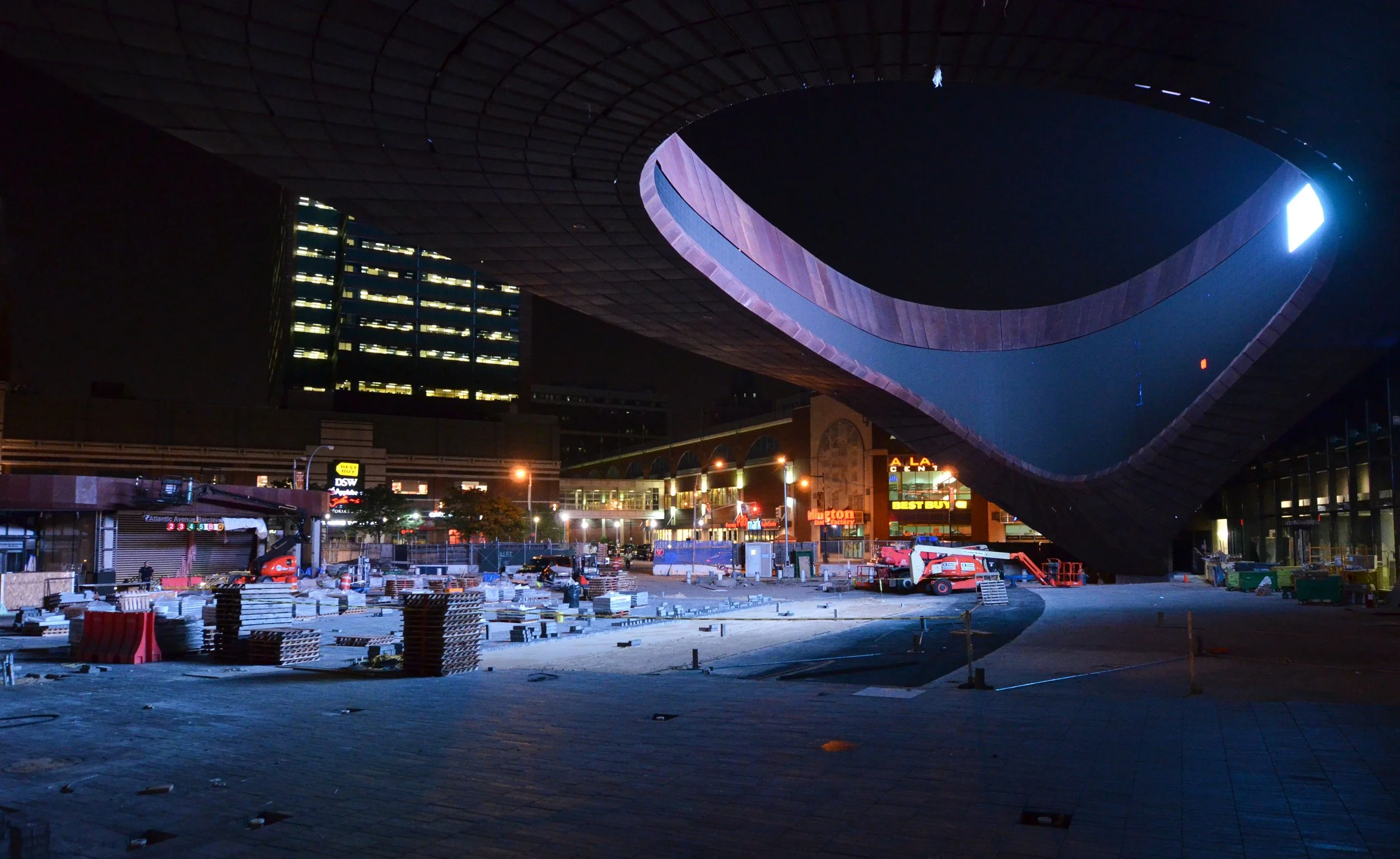 The Barclays Center’s weathered steel envelope wraps the arena massing in a continuous, faceted skin defined by non-standard geometry.