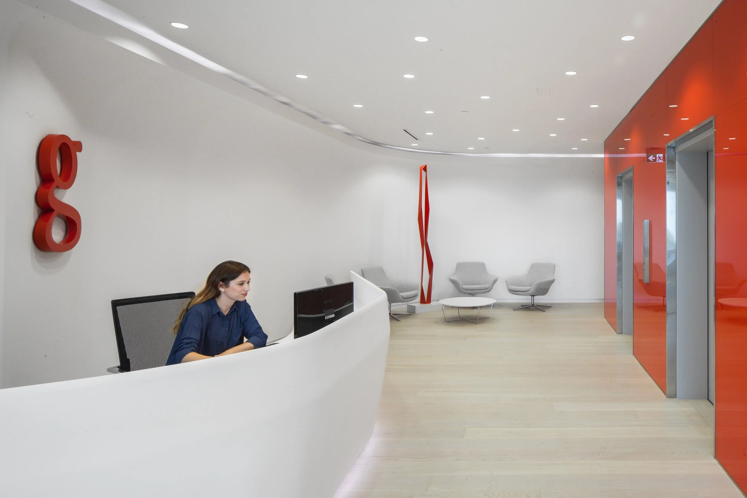 An interior office fit-out centered on a sculptural reception environment. A curved Corian feature wall establishes a gallery-like entry sequence, with the company logo integrated directly into the surface.