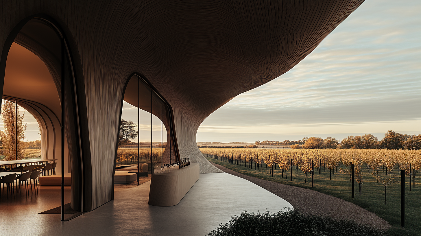 Developed through AI-assisted visualization tools, the project harnesses emerging technologies to study sculptural form, material presence, and spatial sequencing within a vineyard setting. It imagines a winery retreat where architecture becomes an invitation to pause, to gather, and to reconnect.